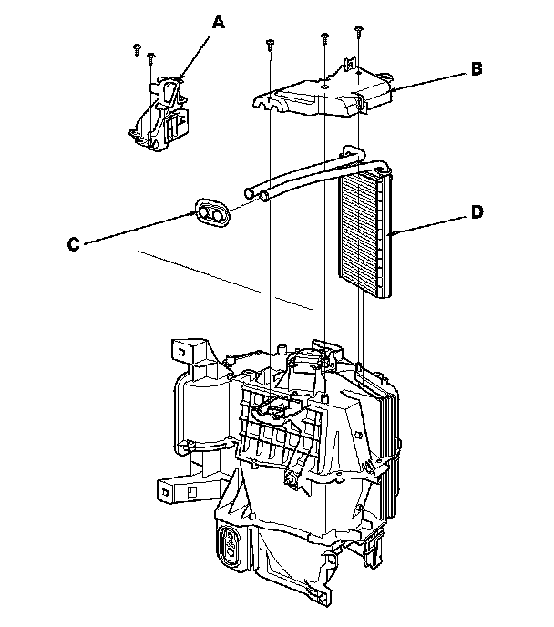 12. Remove the self-tapping screws and the driver's duct (A). Remove the self-tapping screws, the heater core cover (B), the grommet (C), and carefully pull out the heater core (D).