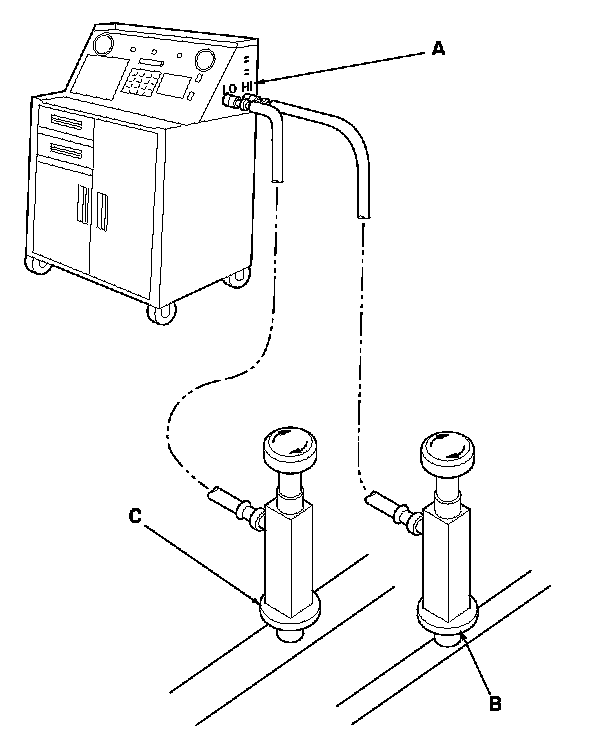 1. Connect an R-134a refrigerant recovery/recycling/charging station (A) to the high-pressure service port (B) and the low-pressure service port (C), as shown, following the equipment manufacturer's instructions.