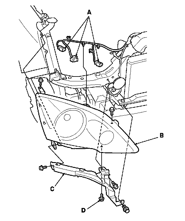 3. Remove the harness clips, screw, clip, and three bolts, then remove the headlight assembly with the corner upper beam (C).