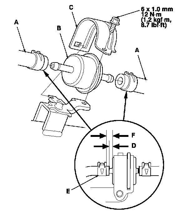 8. Slide the ATF cooler hose on the ATF filter until the hose end is 5-7 mm (0.20-0.28 in.) (D) away from the filter housing, and secure the hose with the clip (E) at 10-12 mm (0.39-0.47 in.) (F) from the filter housing. Install the cooler hose on the other side of the ATF filter in the same manner.