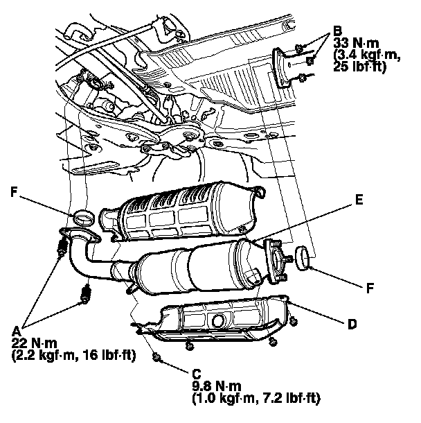 7. Install the parts in the reverse order of removal with new gaskets (F).
