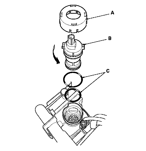 4. Install the parts in the reverse order of removal with new O-rings (C) and a new cap.