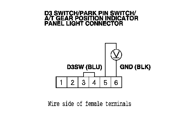 3. Measure the voltage between D3 switch/park pin switch/A/T gear position indicator panel light connector terminals No. 5 and No. 6.