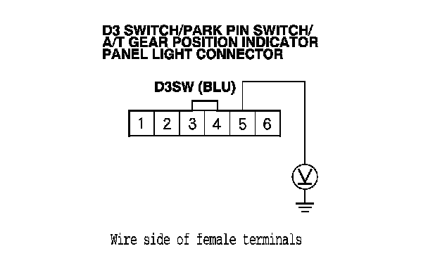 4. Measure the voltage between D3 switch/park pin switch/A/T gear position indicator panel light connector terminal No. 5 and body ground.