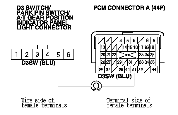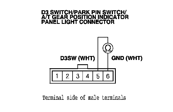 10. Check for continuity between D3 switch/park pin switch/A/T gear position indicator panel light connector terminals No. 5 and No. 6 while pressing the D3 switch several times.