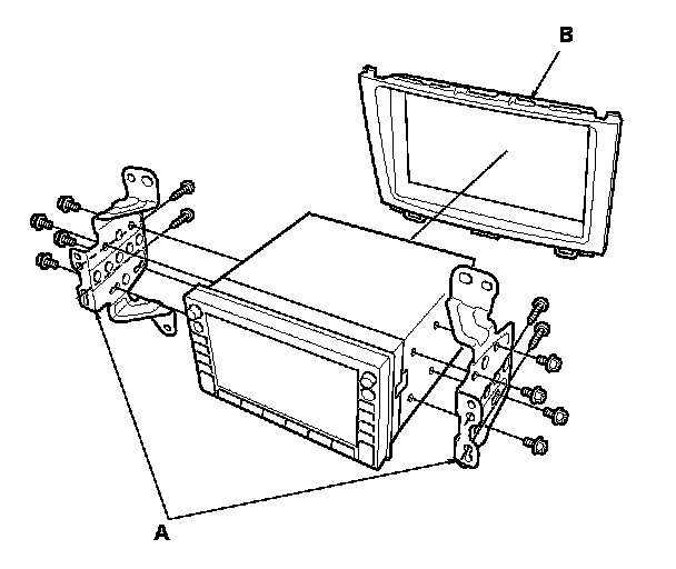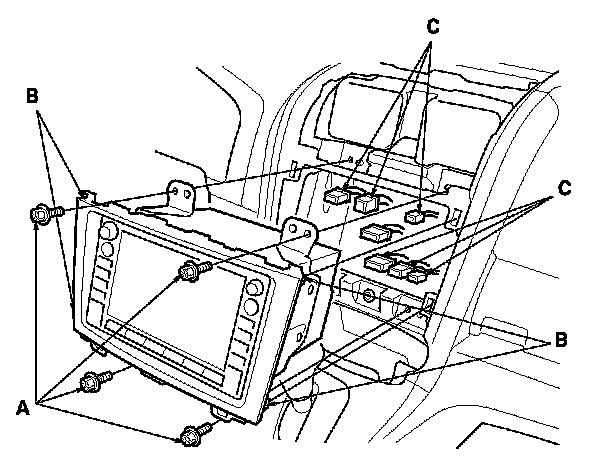 4. Pull the navigation unit away from the dashboard to release the locking clips (B), then disconnect the connectors (C).