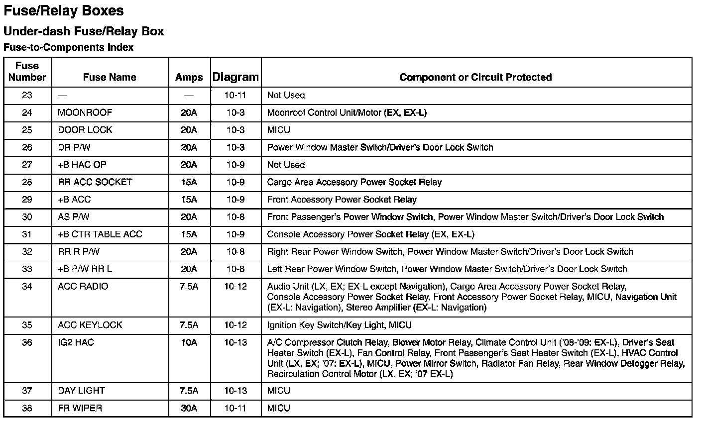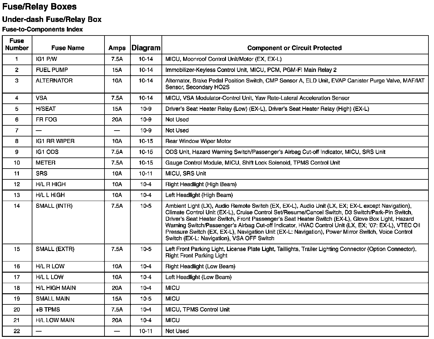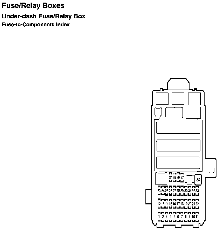 Under-dash Fuse/Relay Box - Fuse-to-Components Index