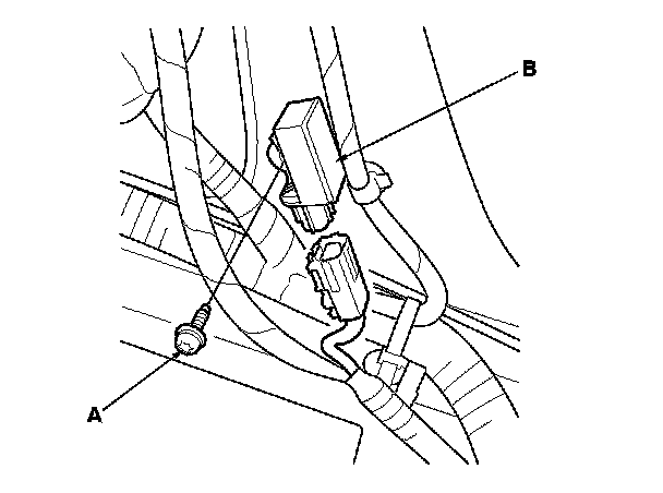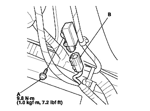 1. Install the new side impact sensor (first) with the TORX bolt (A), then connect the floor wire harness 2P connector (B) to the side impact sensor (first).