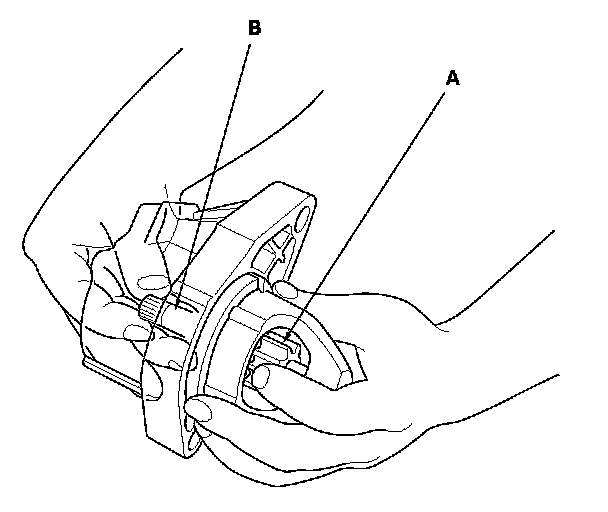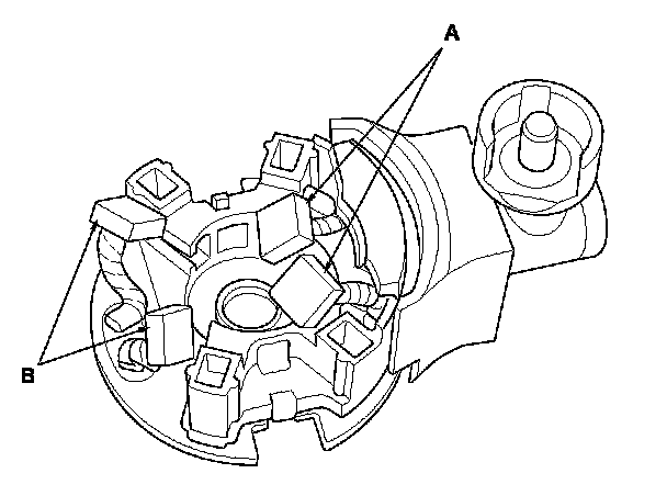 12. Check for continuity between the (+) brush (A) and (-) brush (B). If there is continuity, replace the brush holder assembly.