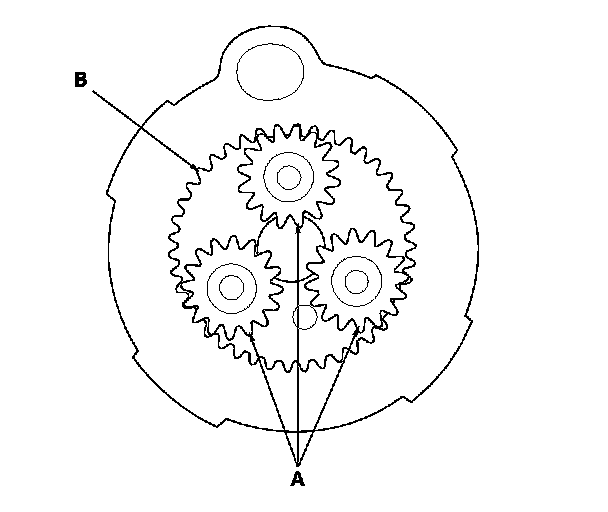 13. Check the planetary gears (A) and internal ring gear (B). Replace them if they are worn or damaged.