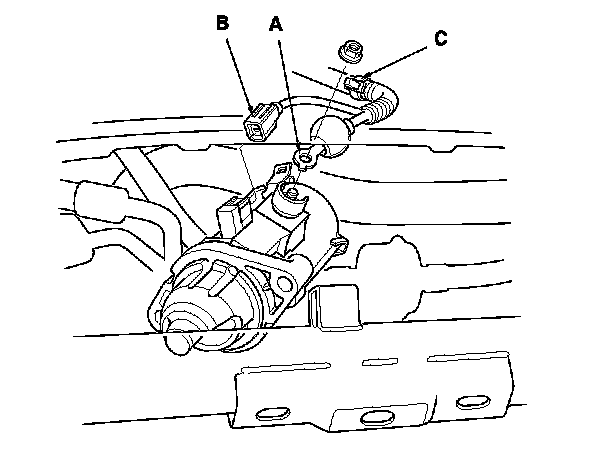 7. Remove the harness clamp (C), then remove the starter.