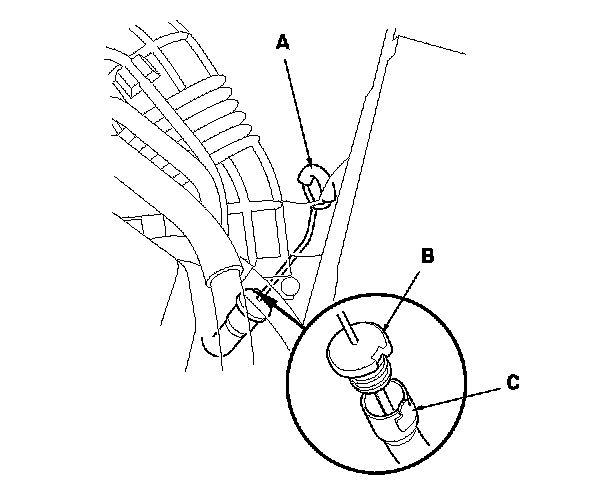 4. Insert the dipstick into the guide tube aligning the notch (B) with the guide tab (C).