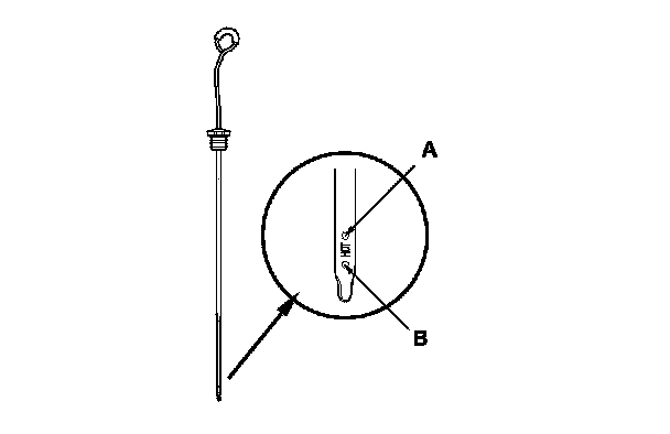 5. Remove the dipstick, and check the fluid level. It should be between the upper mark (A) and the lower mark (B).
