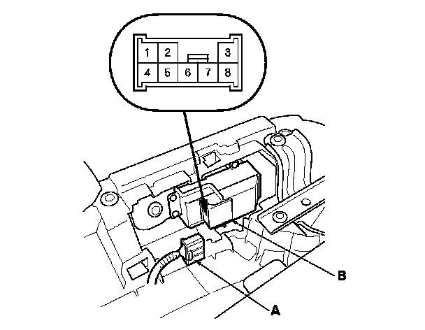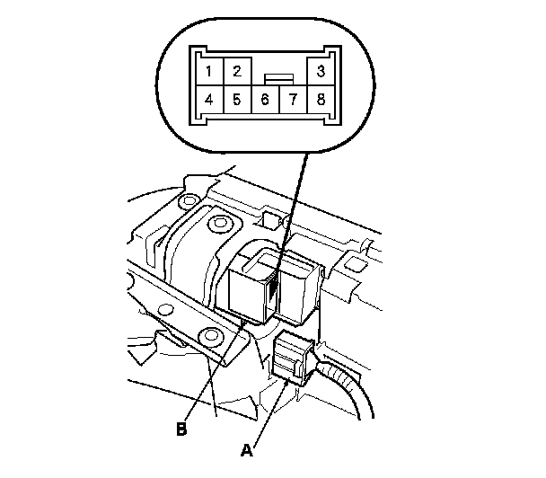2. Disconnect the 8P connector (A) from the passenger's power window switch (B).