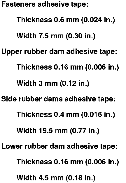 11. Attach the fasteners (A), the upper rubber dam (B), the side rubber dams (C), and the lower rubber dam (D) with adhesive tape to the inside face of the rear window (E) as shown. Before installing the side and the lower rubber dams, apply primer to the inside face of the rear window.
