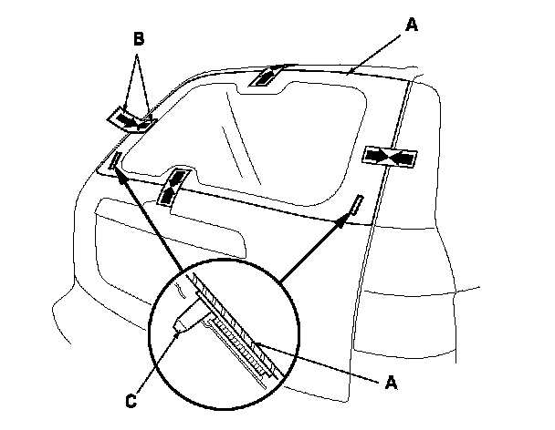 14. Set the rear window (A) in the opening, and center it. Make alignment marks (B) across the rear window and the body with a grease pencil at the four points shown. Make sure both clips (C) contact with the holes of the tailgate corner. Be careful not to touch the rear window where adhesive will be applied.