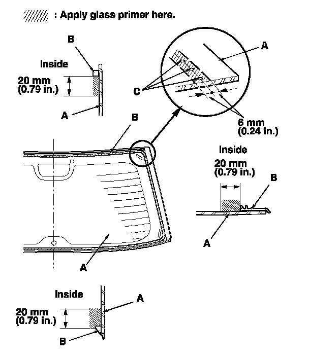 - With the printed dots (C) on the rear window as a guide, apply the glass primer to both side portions of the rear window.