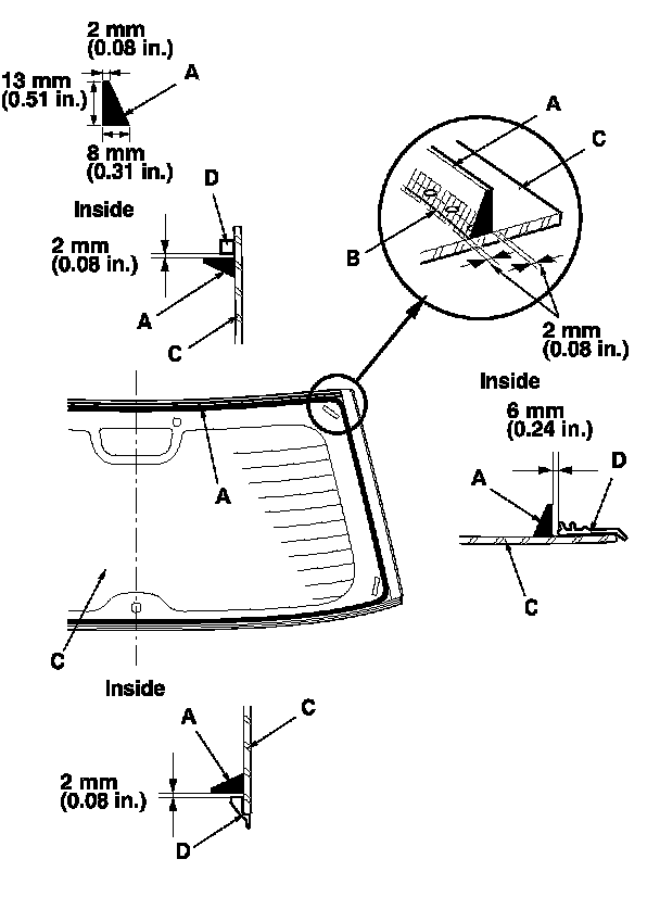 19. Put the cartridge in a caulking gun, and run a bead of adhesive (A) on the glass primer trace (B) around the edge of the rear window (C) and along the rubber dams (D) as shown.