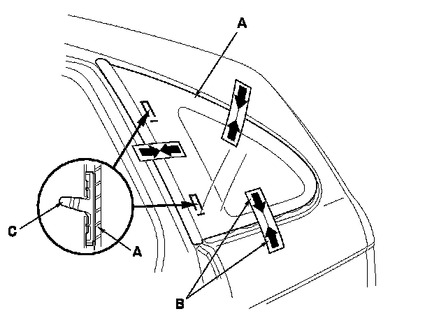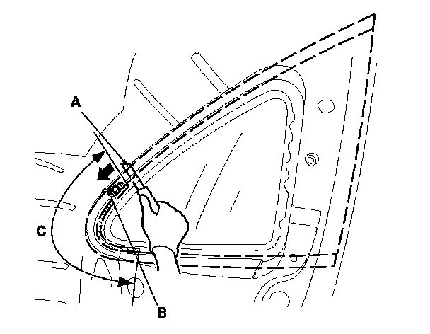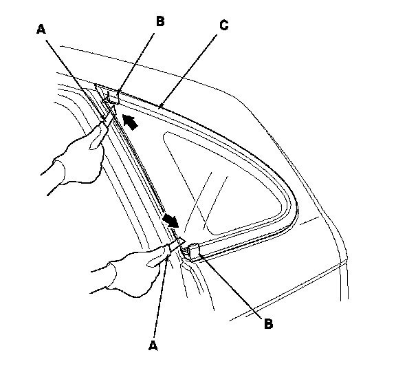 7. From inside the vehicle, use a knife (A) to cut the rear clip (B) of the quarter glass molding, then cut through the adhesive (C) of the quarter glass rear corner.