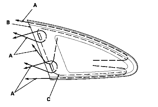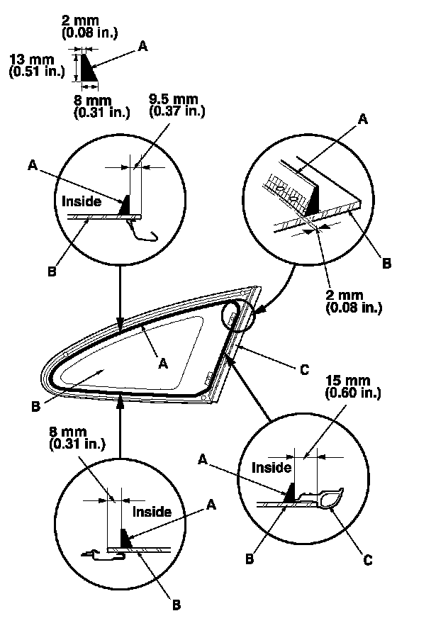 13. Set the quarter glass (A) in the opening, and make alignment marks (B) across the quarter glass and the body with a grease pencil at the three points shown. Make sure both clips (C) contact with the edge of the body holes. Be careful not to touch the glass where adhesive will be applied.