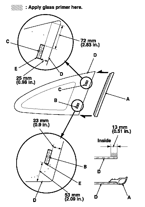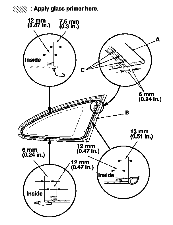- With the printed dots (C) on the quarter glass as a guide, apply the glass primer to the rear corner, upper corner, and lower corner portions of the quarter glass.