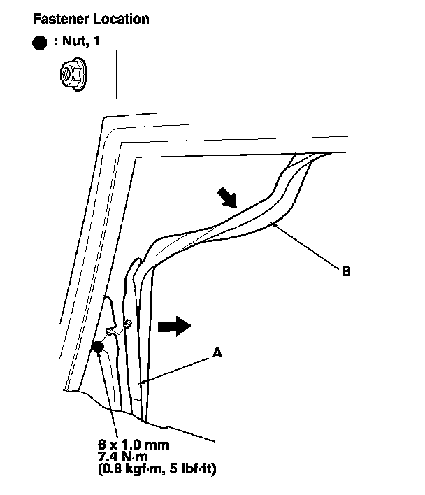 5. Remove the nut from the rear lower channel (A). Pull the glass run channel (B) away as needed. Pull the rear lower channel forward from the door.