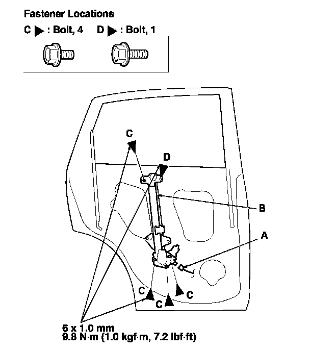 11. Remove the bolts (C), and loosen the bolt (D), then remove the regulator through the hole in the door.