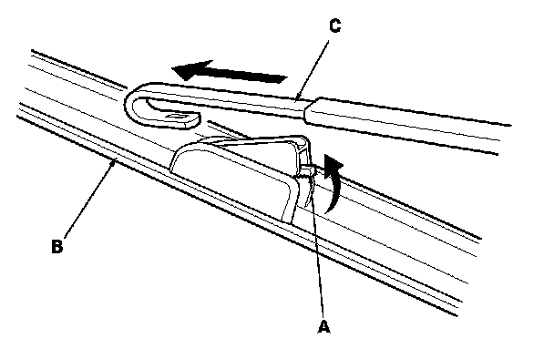 2. Pull up and hold the tab (A), and slide the wiper blade (B) toward the tabs until it releases from the wiper arm (C).