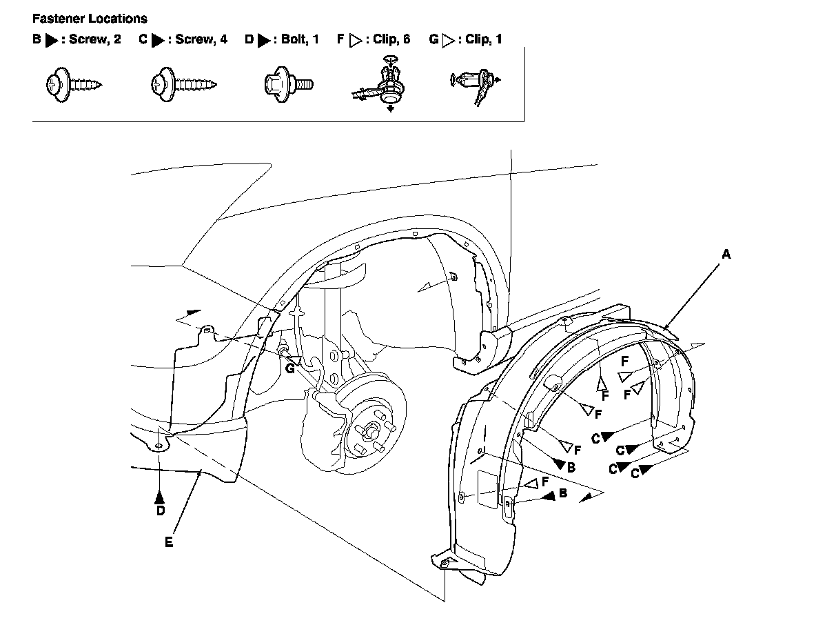 -2 Remove the clips (F, G) securing the front inner fender (and the splash shield) on the body.