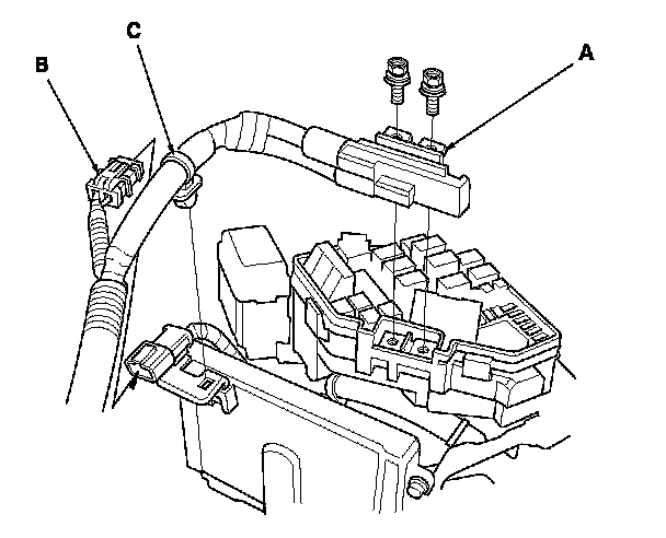 6. Remove the battery cables (A) from the under-hood fuse/relay box.