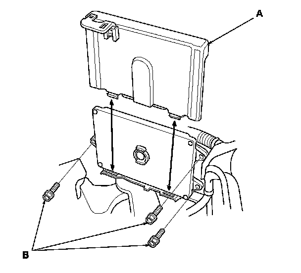 8. Remove the powertrain control module (PCM) cover (A), then remove the three bolts (B) securing the PCM.