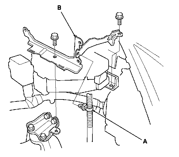 11. Remove the harness clamp (A), then remove the PCM bracket (B).