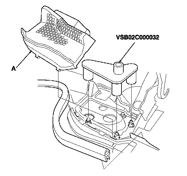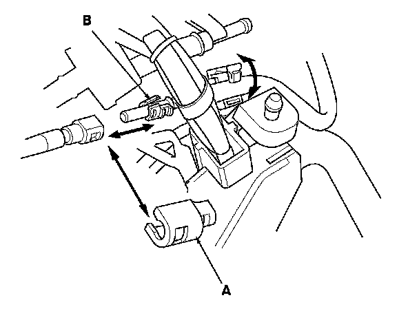 13. Remove the quick-connect fitting cover (A), then disconnect the fuel feed hose (B). Fuel Line/Quick-Connect Fitting Removal