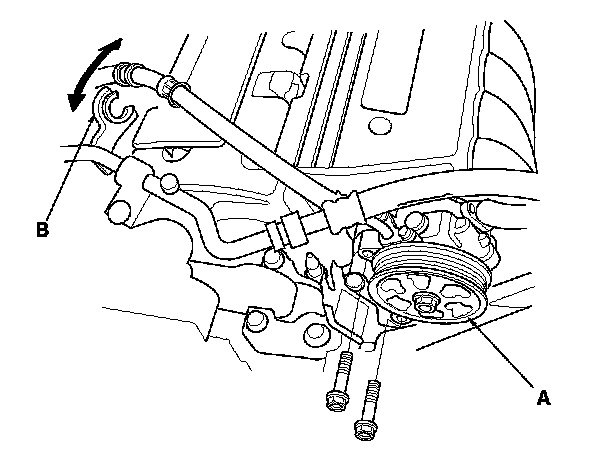 15. Remove the power steering (P/S) pump (A) without disconnecting the P/S hoses, then remove the P/S hose from the clamp (B).
