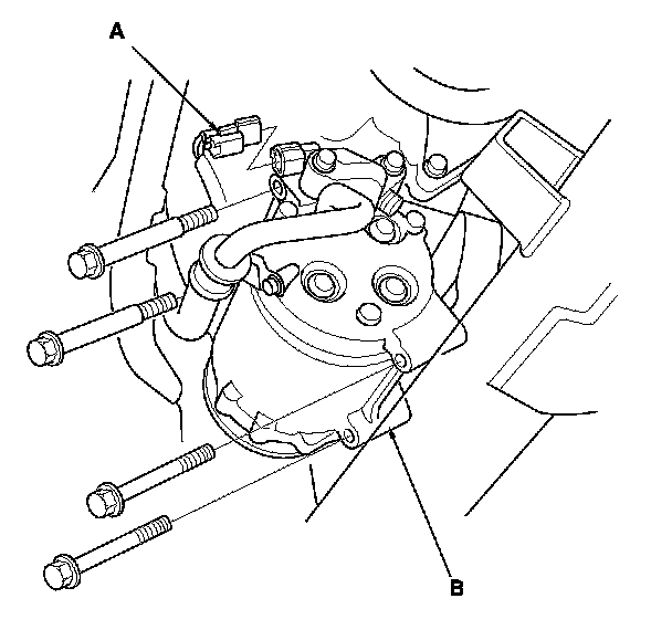 33. Disconnect the A/C compressor clutch connector (A), then remove the A/C compressor (B) without disconnecting the A/C hoses. Do not bend the A/C hoses excessively.