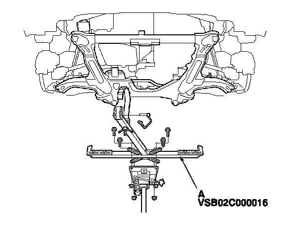 46. Attach the subframe adapter (A) to the subframe and hang the belt of the subframe adapter over the front of the subframe, then secure the belt with its stop.