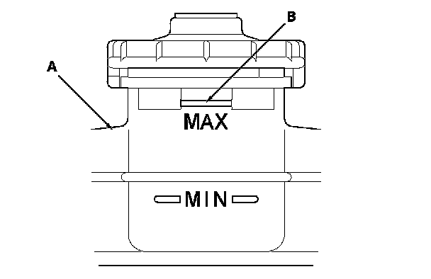 1. Make sure the brake fluid level in the reservoir (A) is at the MAX (upper) level line (B).