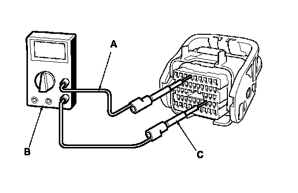 7. Connect one side of the patch cord (A) terminals to a commercially available digital multimeter (B), and connect the other side of the patch cord terminals to a commercially available banana jack (Pomona Electronics Tool No. 3563 or equivalent) (C).