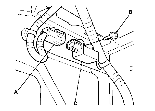 1. Install the front impact sensor with a new TORX bolt (A), then connect the engine compartment wire harness 2P connector (B) to the front impact sensor (C).