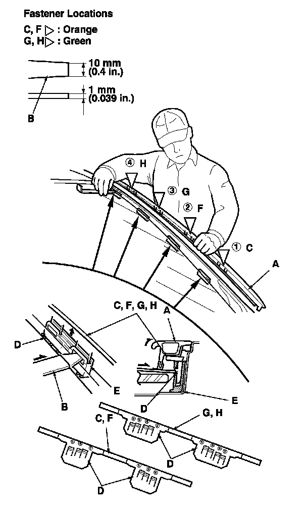 3. Install the molding in the reverse order of removal, and note these items:
