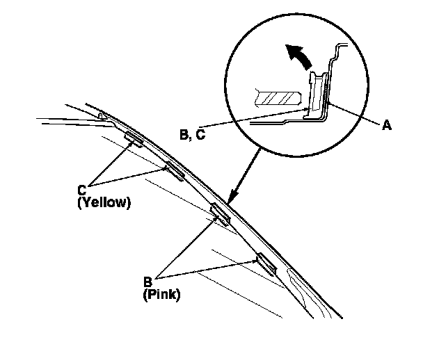 1. Carefully scrape off the adhesive tape (A) under the retainers (B, C) while heating it with a heat gun.