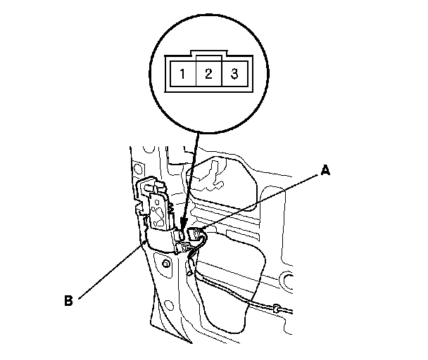 2. Disconnect the 3P connector (A) from the driver's door lock actuator (B).
