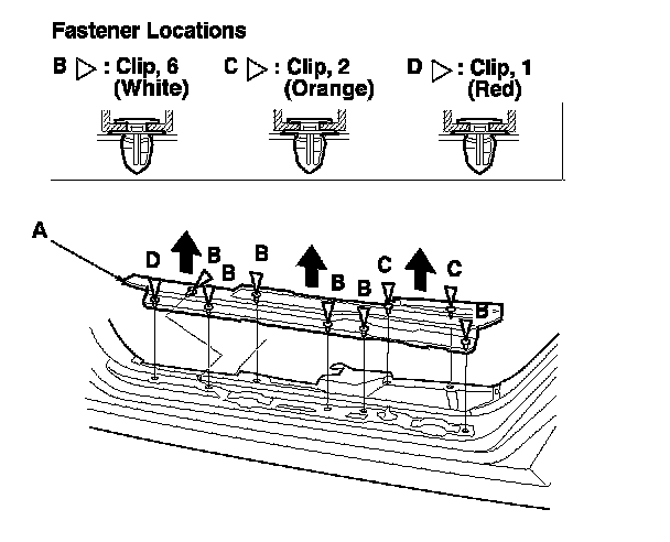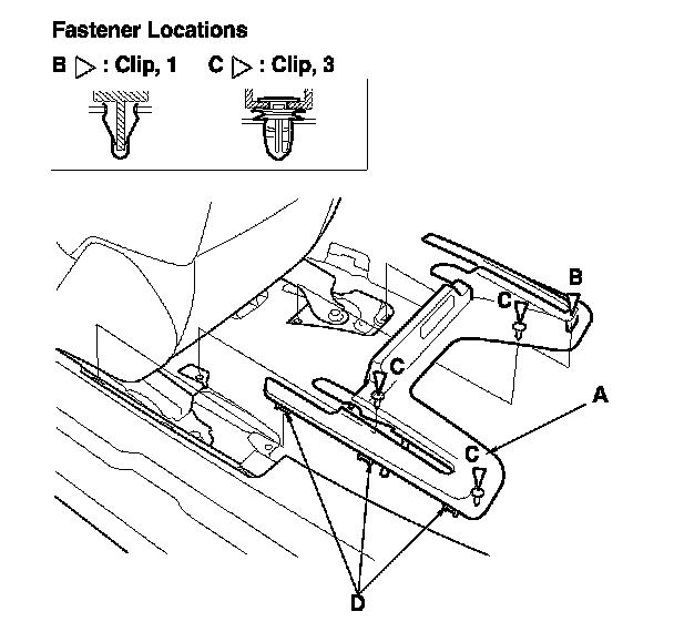 - Pull the front seat track floor cover (A) up by hand to detach the clips (B, C) and release the hooks (D) from the carpet, then remove the cover.
