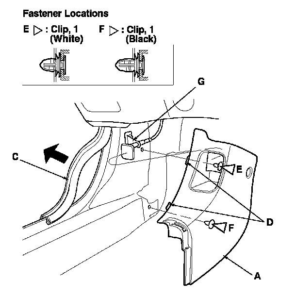 -2 Pull the kick panel back by hand to detach the clips (E, F), then remove the panel. On the driver's side, pull the hood opener knob (G) and hold it while removing the panel.