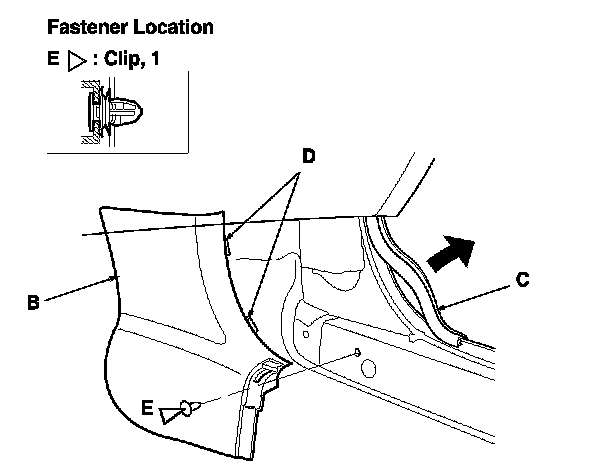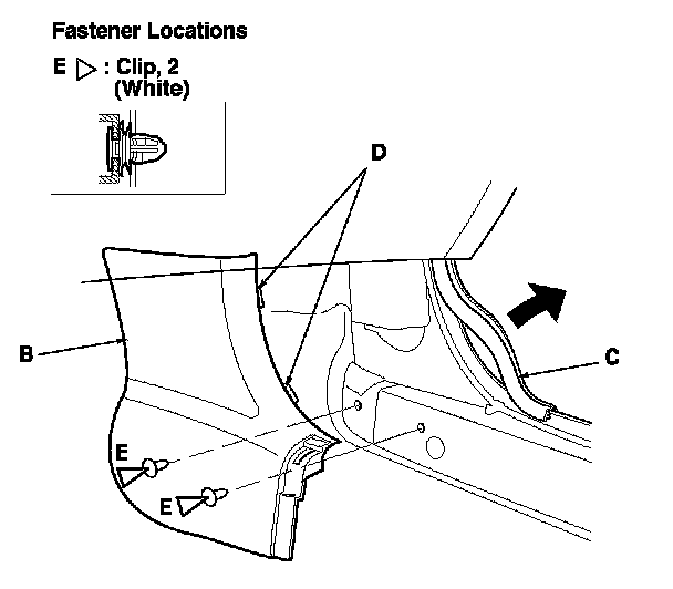 2. Pull the front door sill trim (A) up by hand to detach the clips (B, C, D), then remove the trim.