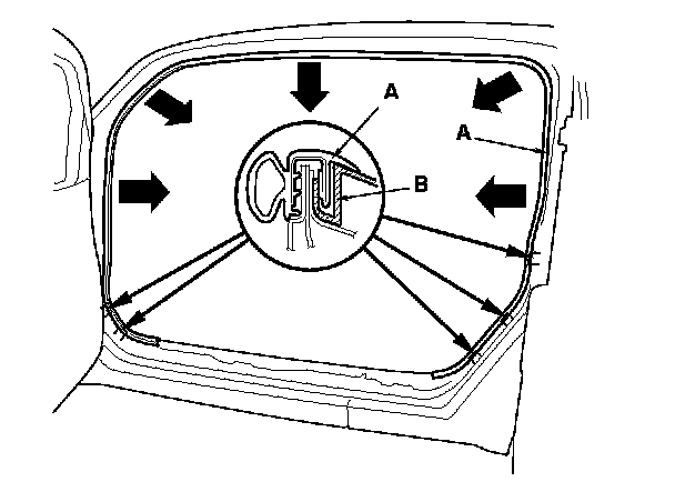 4. Pull out the front door inner seal (A) from the trim hooks (B) and around the front door opening flange, then remove the seal.