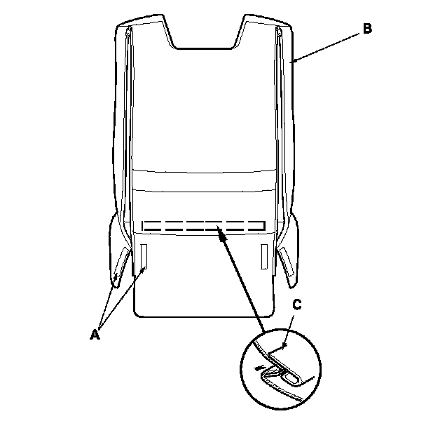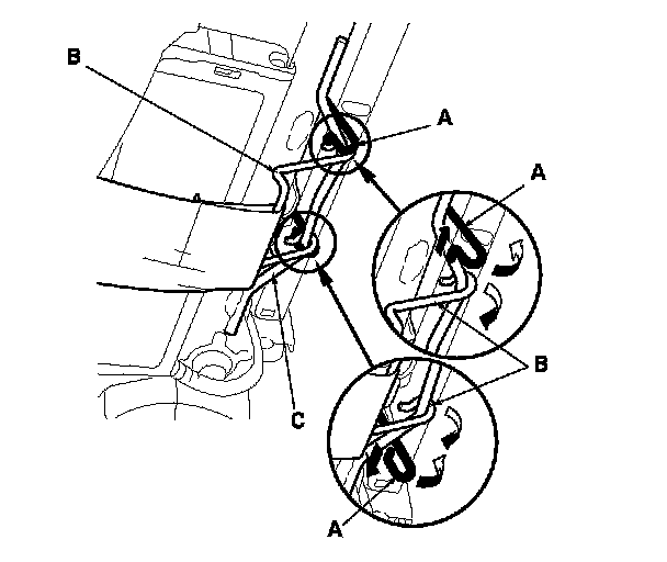 10. Release the front airbag attachment wire (A) and the rear airbag attachment wire (B) from the seat-back frame (C).