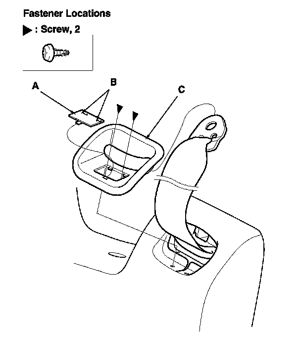 9. Using the appropriate trim tool, pry out on the front seat belt trim cap (A) to release the hooks (B), then remove the screws securing the shoulder front seat belt trim (C).