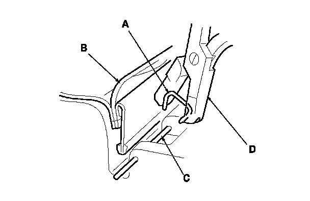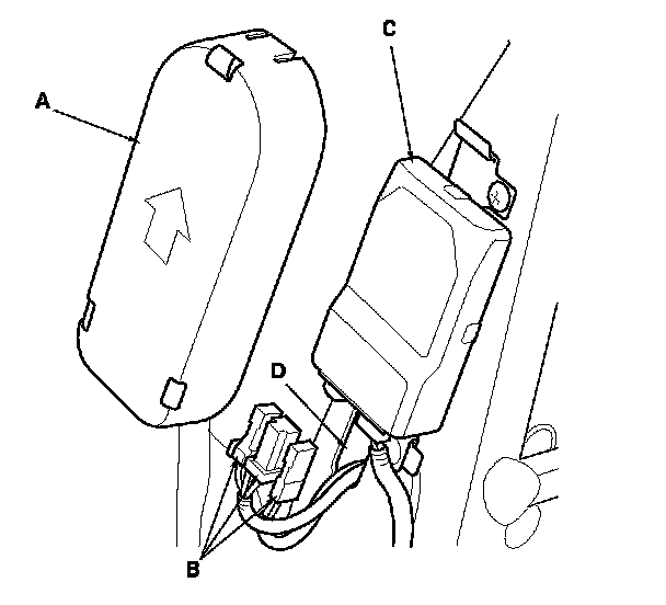 11. Passenger's seat: Remove the ODS unit cover (A), and disconnect the OPDS sensor connectors (B) from the ODS unit (C), and pull them in through the hole (D) in the seat frame.