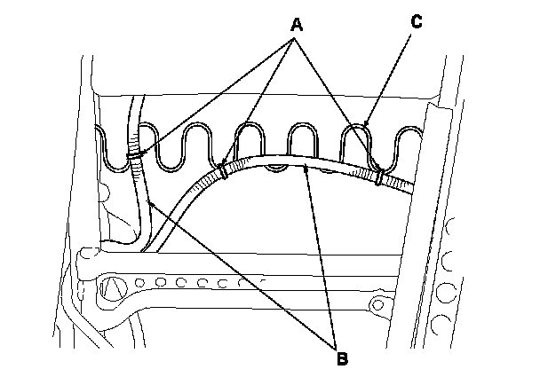 12. Passenger's seat: Release the wire ties (A) fastening the OPDS sensor harnesses (B) to the seat-back frame spring (C).